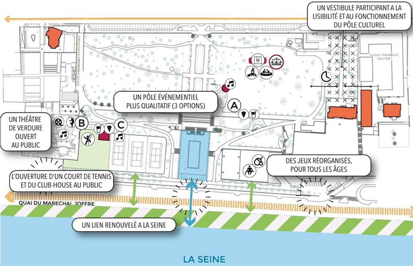 - de l’ouverture du parc à de nouveaux espaces et usages : théâtre de verdure, courts de tennis, centre horticole, caves ;